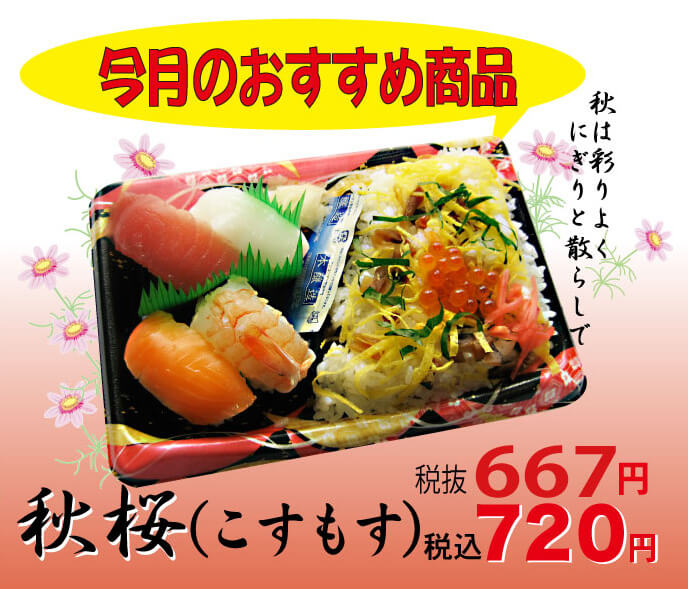- まぐろ、いか、えび、穴子、玉子、いなり、太巻、サーモン巻・胡瓜巻
