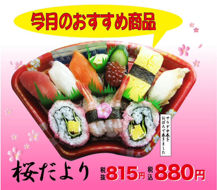 - まぐろ、いか、えび、サーモン、ねぎとろ軍艦、シーチキン軍艦、玉子、いなり、玉子巻、胡瓜巻